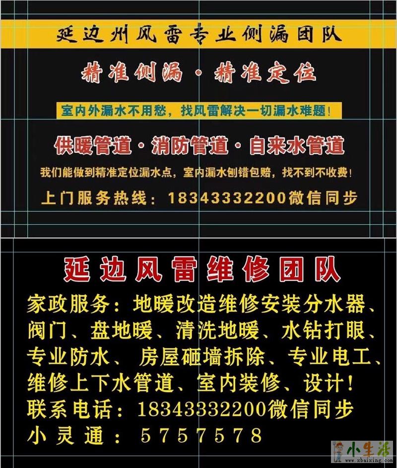x~b~a~i~x~i~n~g~c~o~m便民服务:延边州风雷专业维修检测漏水团队,专业进口仪器、精准定位,本着破坏较小 损失较少,找不到不收费,刨错了双倍包赔的经营理念全力为社会提供方便,延吉市内孤寡老人 残疾人免费检测。www.xbaixing.com小生活网